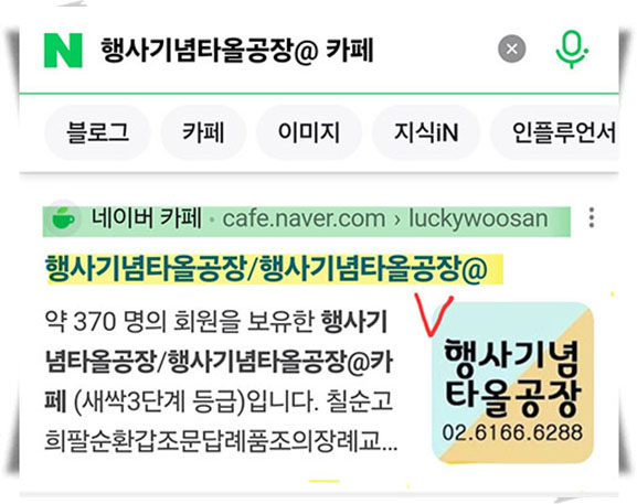 그래서 행사기념타올공장@ 카페 로 초록창에서 검색후 카페에서 제작 사례나 비용 전부 확인하고 전화 신청함
